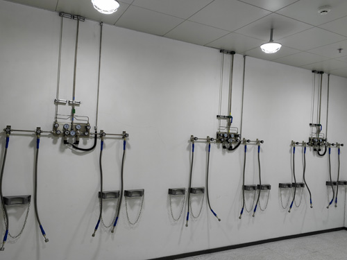8.氣瓶間內的空氣氧氣瓶與氣壓的調整器區間內采取SS316L超高壓電低壓金屬件橡膠管銜接無進行滲透。超高壓電低壓橡膠管為韌性橡膠管,以做到銜接的便于性。并自導加固鋼纜,有效防范毀滅性情況報告下,氧氣瓶閥影響等跡象面臨的超高壓電低壓“抽鞭”事情。氣壓的調整器與地埋管的銜接玩法為雙環卡套。